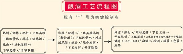 基酒生产周期长,同一批原料要经过九次蒸(烤酒)八次发酵、七次取酒、历时整整一年时间。大曲储存期长;经过六个月储存方可进入白酒生产,长期储存可以使发酵所需各种酶类的活性得到恢复提高,微生物种群得到平衡,基酒品质的提高有重要作用。基酒酒龄长,必须经过三年以内的存放陈化,才能勾兑,陈化过程中甲醇,醛类等有害物质进一挥发,酒体变醇和;空气透过缸壁与酒液接触缓慢氧化,使酒产生成熟的老陈味;同时酒中的酒精分子与水分子会合以氢键形式进行缔合,从而使酒的口感变得更加柔和、适中、提高了酒的品质。